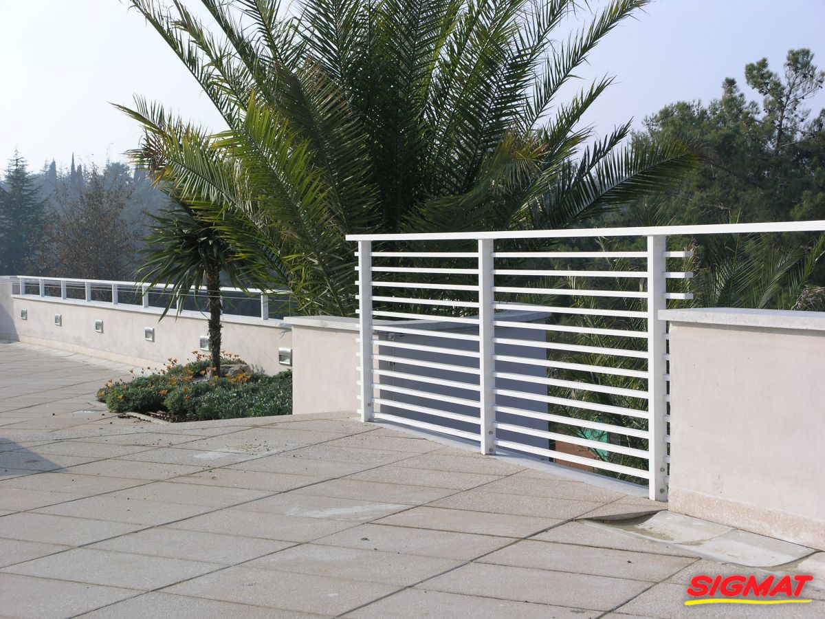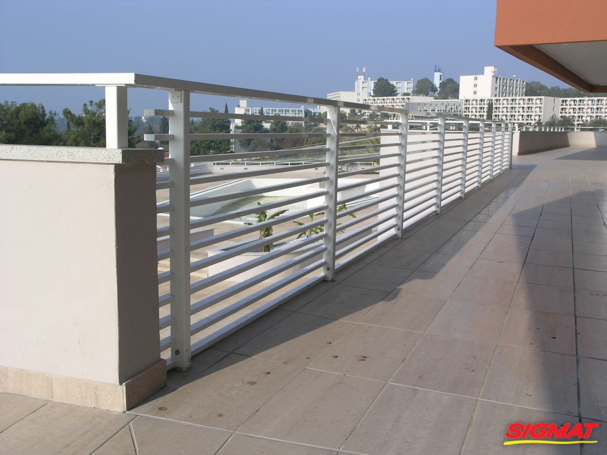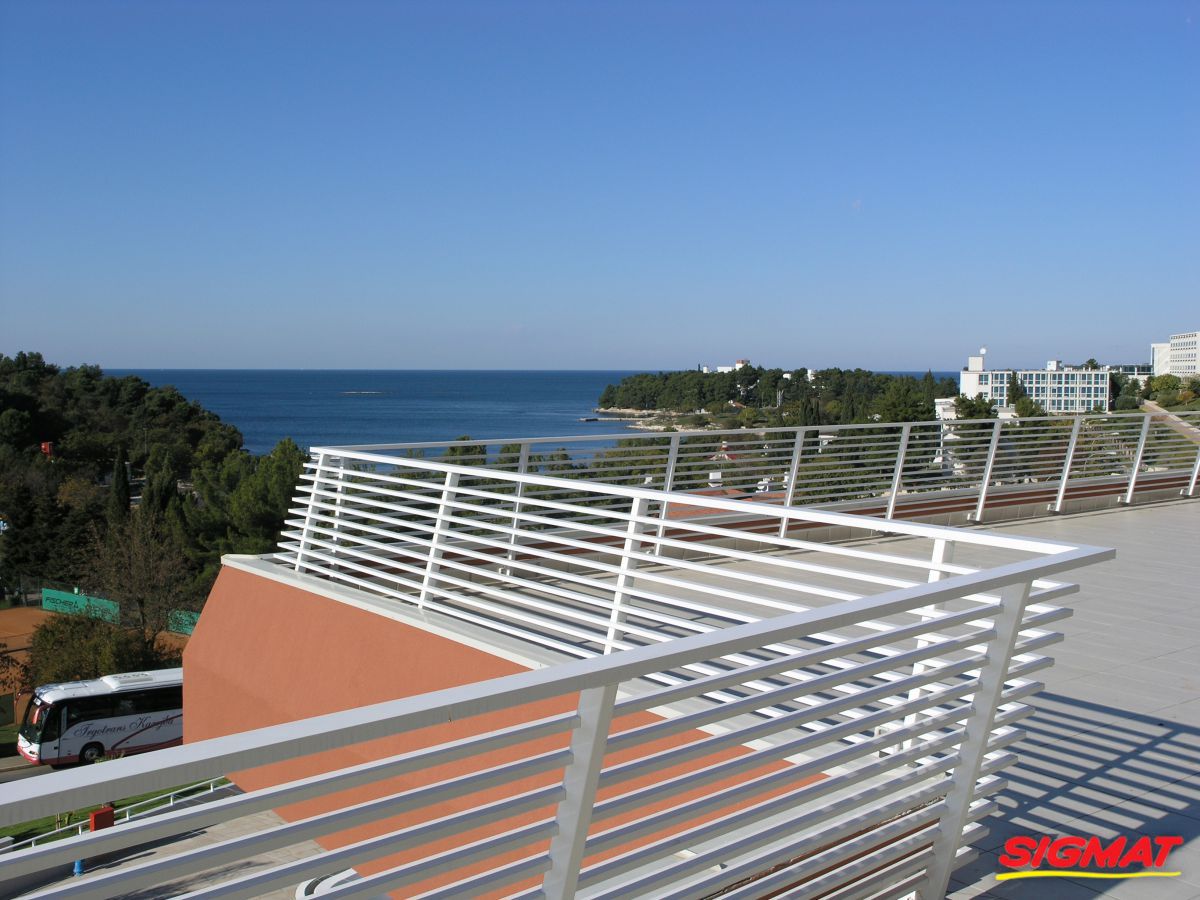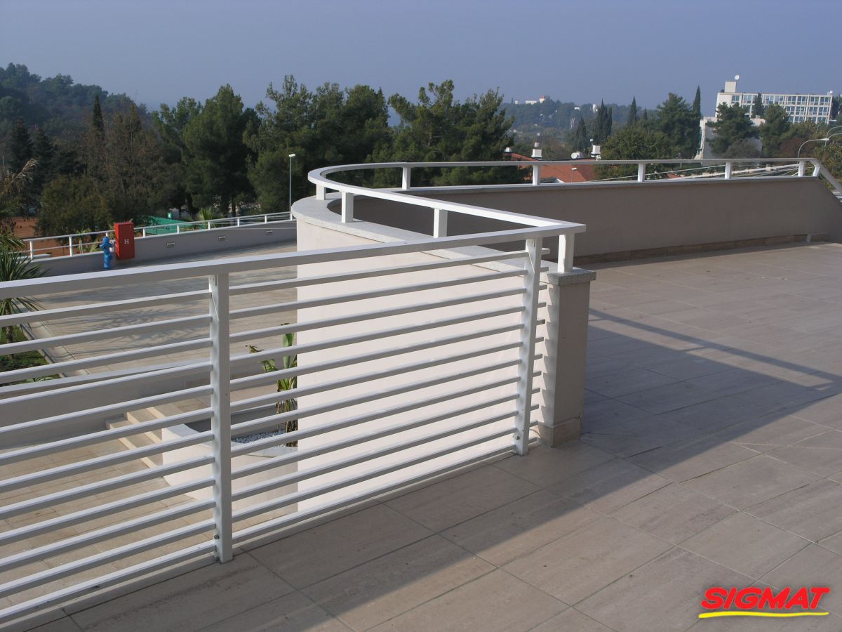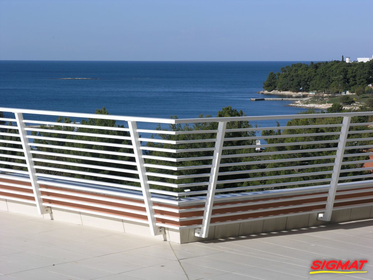 Albatros Aluminijske ograde Balkon Hoteli Aluminijska plastificirana ograda, boja po želji. Posebnu atraktivnost ovom modelu daje čak 12 horizontalnih ispuna. Staklena ograda visine je jednoga metra. Sljedeće