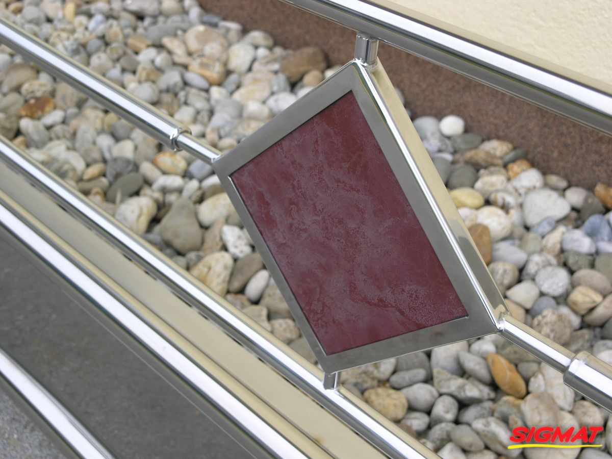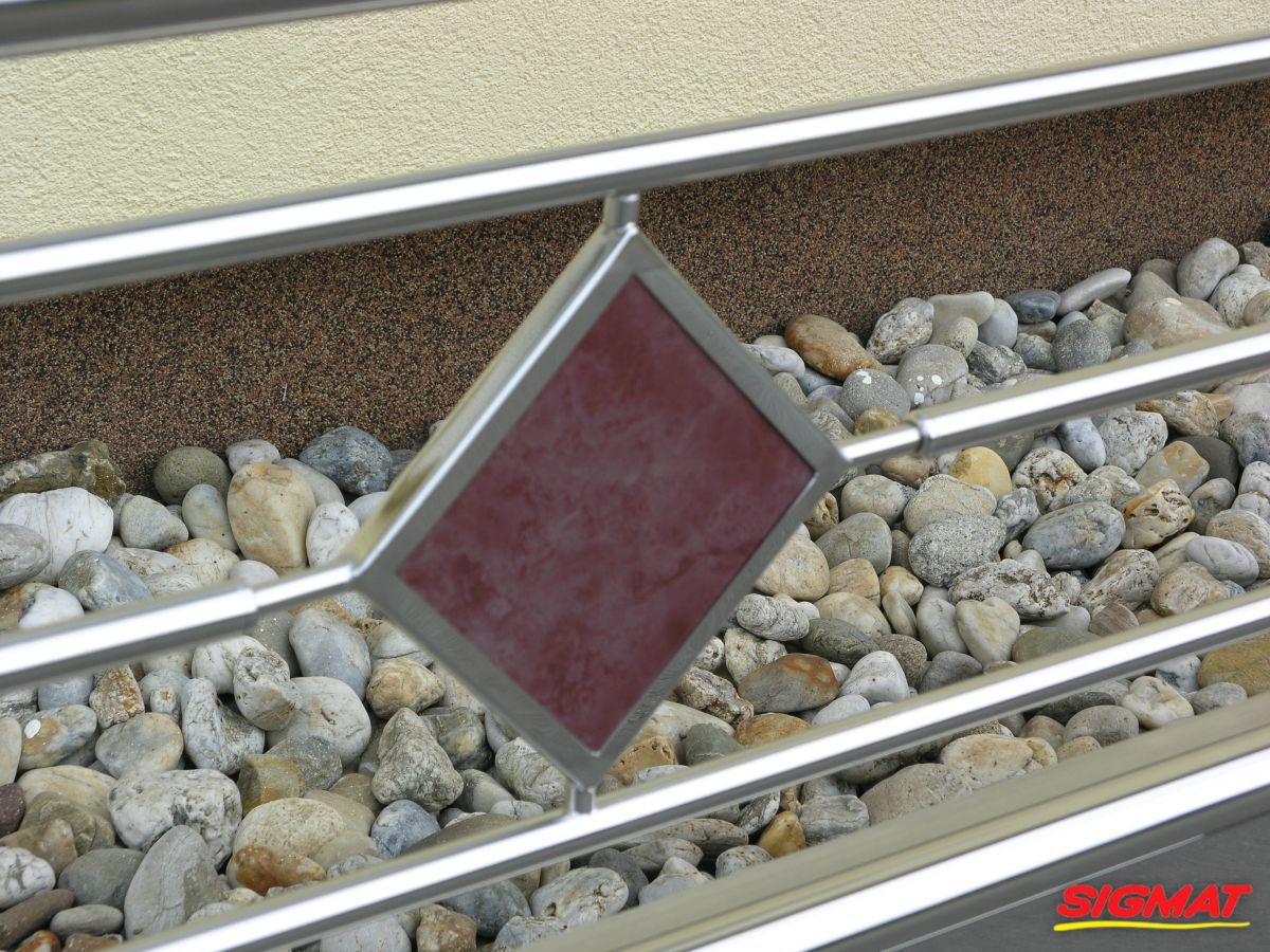 U sredini ograde nalaze se 3 horizontalne inox cijevi između kojih je kamen u okviru.